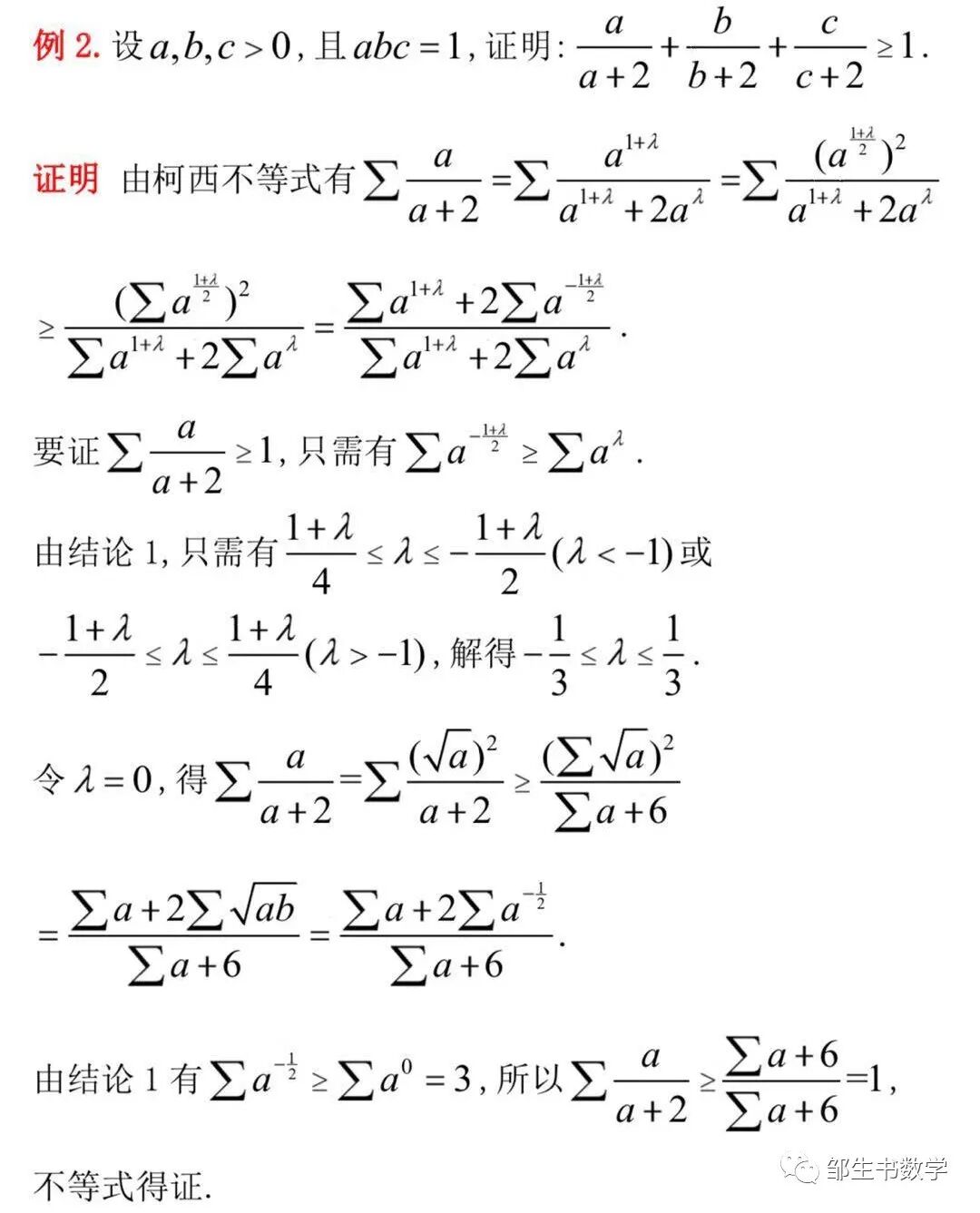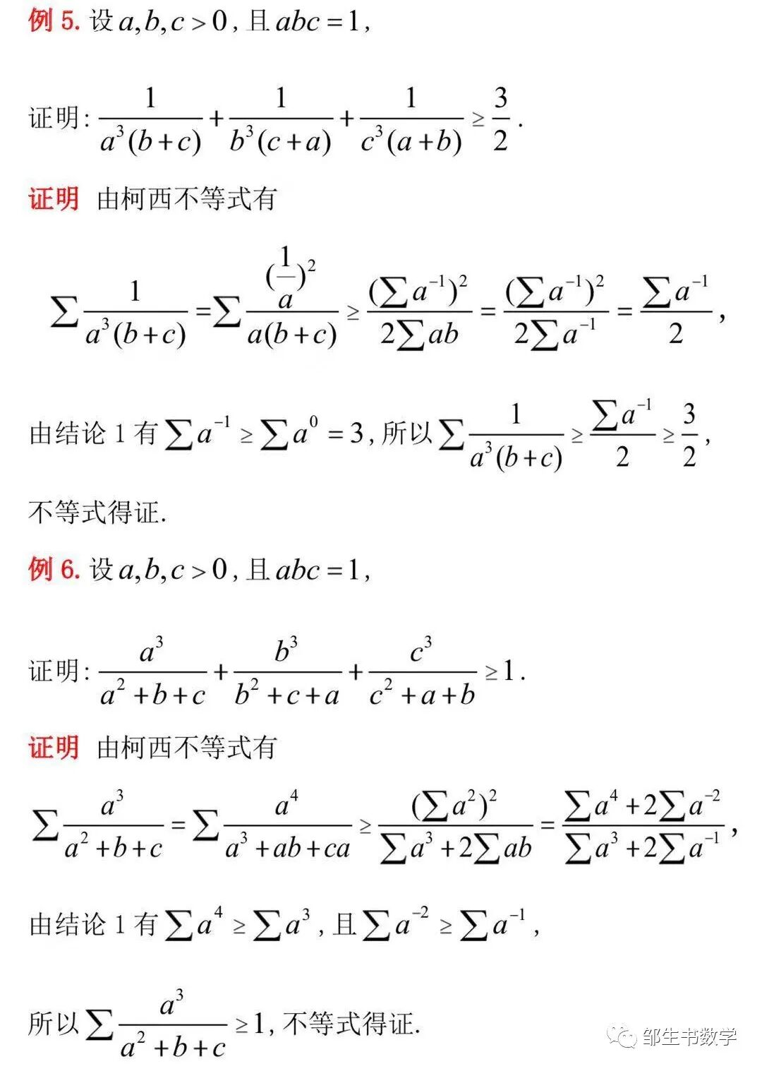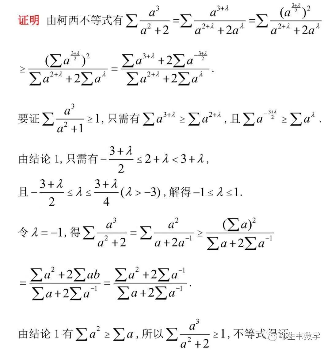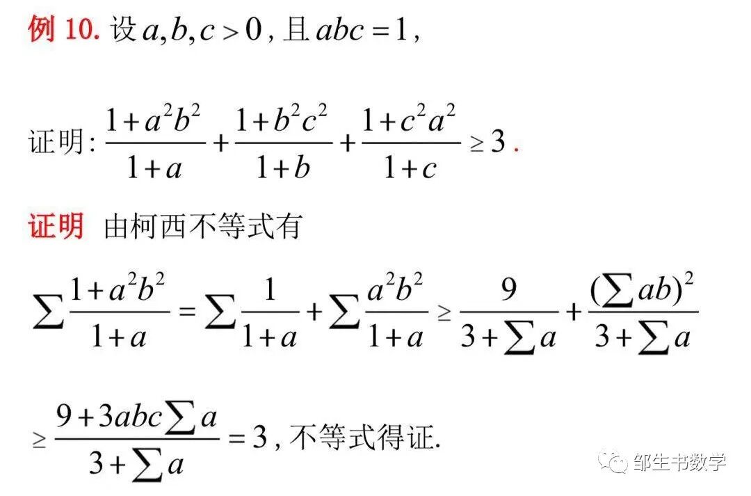 柯西不等式是不等式证明的强有力的工具,但在处理一些复杂的不等式问题时,往往难以直接应用柯西不等式,这就需要根据题目的结构特点来进行适当的配凑,其中关键的系数可由待定系数法得到.本文正是利用柯西不等式结合待定系数法,并由结论1得到了关键的系数-4/3,才获得了定理1的非常巧妙的证明.下面给出几个例子来说明柯西不等式结合待定系数法的思路在此类条件为abc=1的不等式证明中的应用.