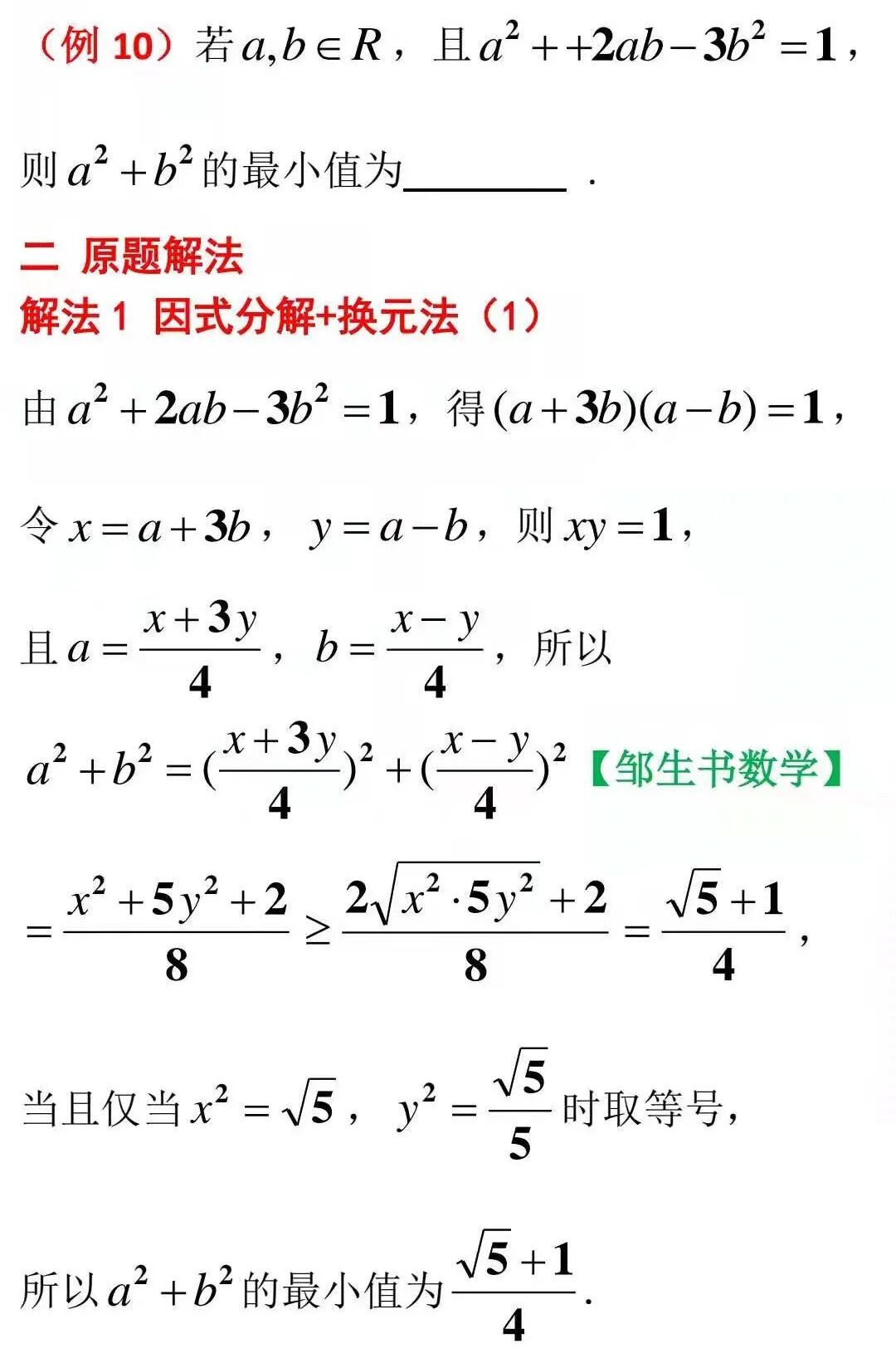 笔者在邹生书老师的微信公众号学习了胡云端老师的《基本不等式的常见应用举例》,获益良多。其中例10与我之前做过的一道题非常相似,我尝试用不同的解法进行解答,发现都可以做出来。当然选取的有些方法可能没有常规方法的计算和转化那么简单,但也能体现数学各章节知识之间的联系。在今后的教育教学过程中,我们可以经常有意识的引导学生将知识系统化。现解答如下,供有兴趣的同行参考,也欢迎交流与探讨。