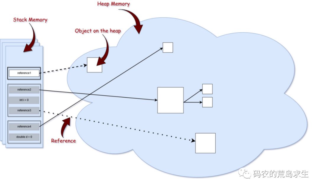 Java的内存模型中同样有栈和堆这样的概念,如下图所示,在Java函数中我们定义的内置数据类型比如int a = 0,是直接存放在栈上的,引用类型,也就是用new关键字定义的变量是分配在堆上的。和C/C++一样,每个Java函数在执行时都有自己的栈帧。随着函数的调用,栈不断的扩大。当函数调用完毕后栈帧被回收,在堆上分配的变量依然可以被后续函数使用。Java程序员无需像C/C++程序员一样需要关心内存回收的问题,这一切都是Java的解释器JVM来管理的。