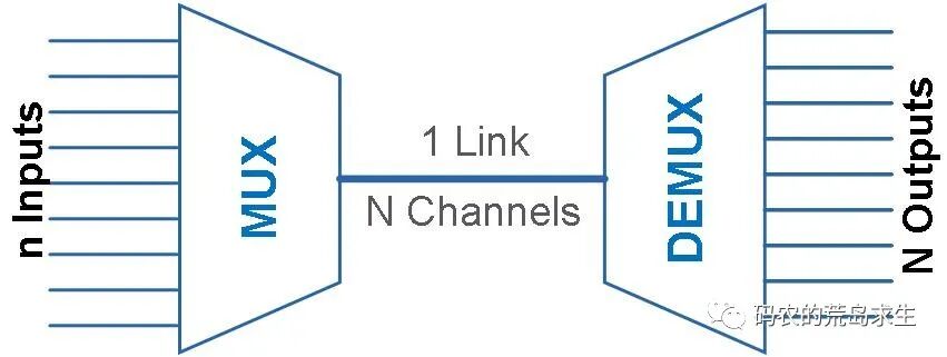 multiplexing一词其实多用于通信领域,为了充分利用通信线路,希望在一个信道中传输多路信号,要想在一个信道中传输多路信号就需要把这多路信号结合为一路,将多路信号组合成一个信号的设备被称为multiplexer,显然接收方接收到这一路组合后的信号后要恢复原先的多路信号,这个设备被称为demultiplexer,如图所示:
