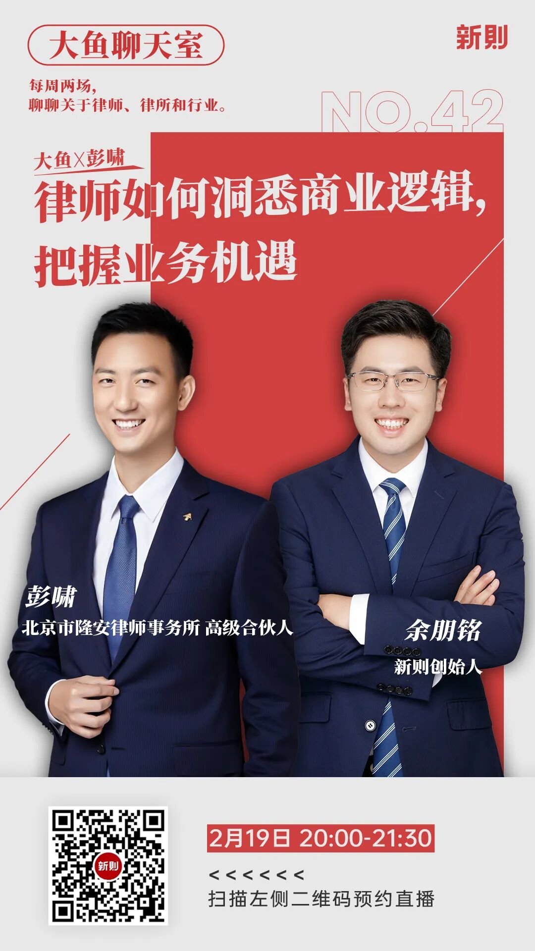 2月19日(周六)晚8点,大鱼聊天室邀请到北京市隆安律师事务所高级合伙人彭啸律师,一起聊聊「律师如何洞悉商业逻辑,把握业务机遇」。直播不可回放,欢迎关注视频号,预约直播。