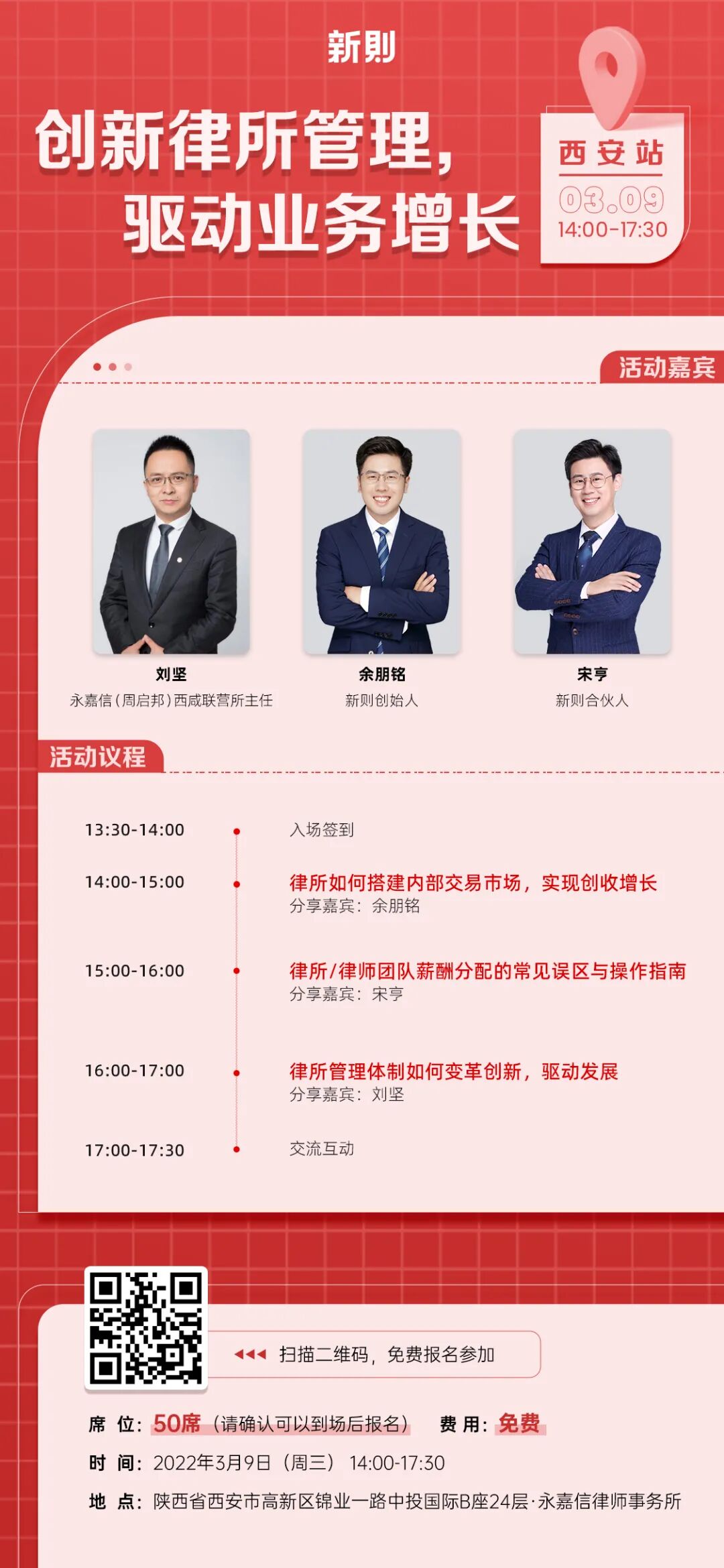 3月9日(周三)下午2点,新则派·西安站,与大家一起聊聊「创新律所管理,驱动业务增长」,本次活动共50席,欢迎扫码免费报名参加。