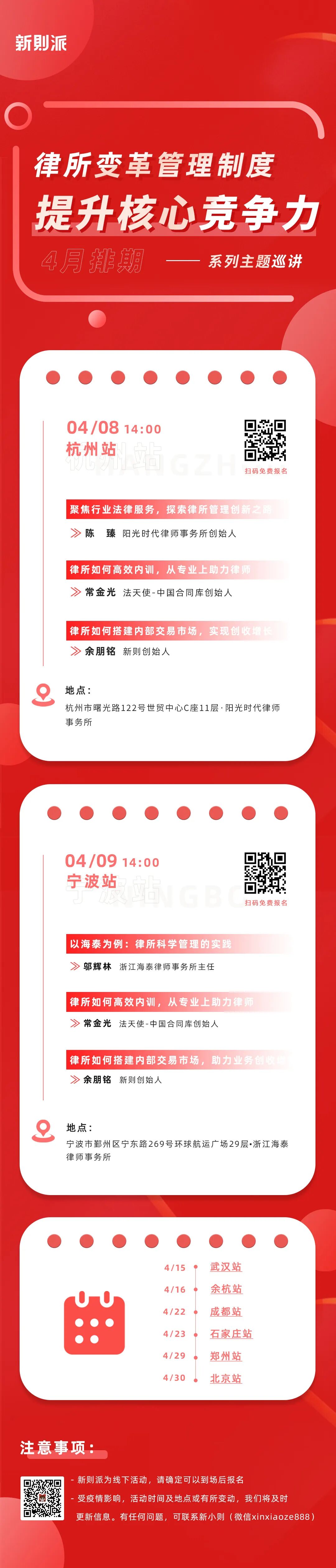 4月8日、4月9日,围绕「律所如何变革管理制度,提升核心竞争力」的主题,新则将在杭州和宁波举办两场新则派,欢迎扫码免费报名。