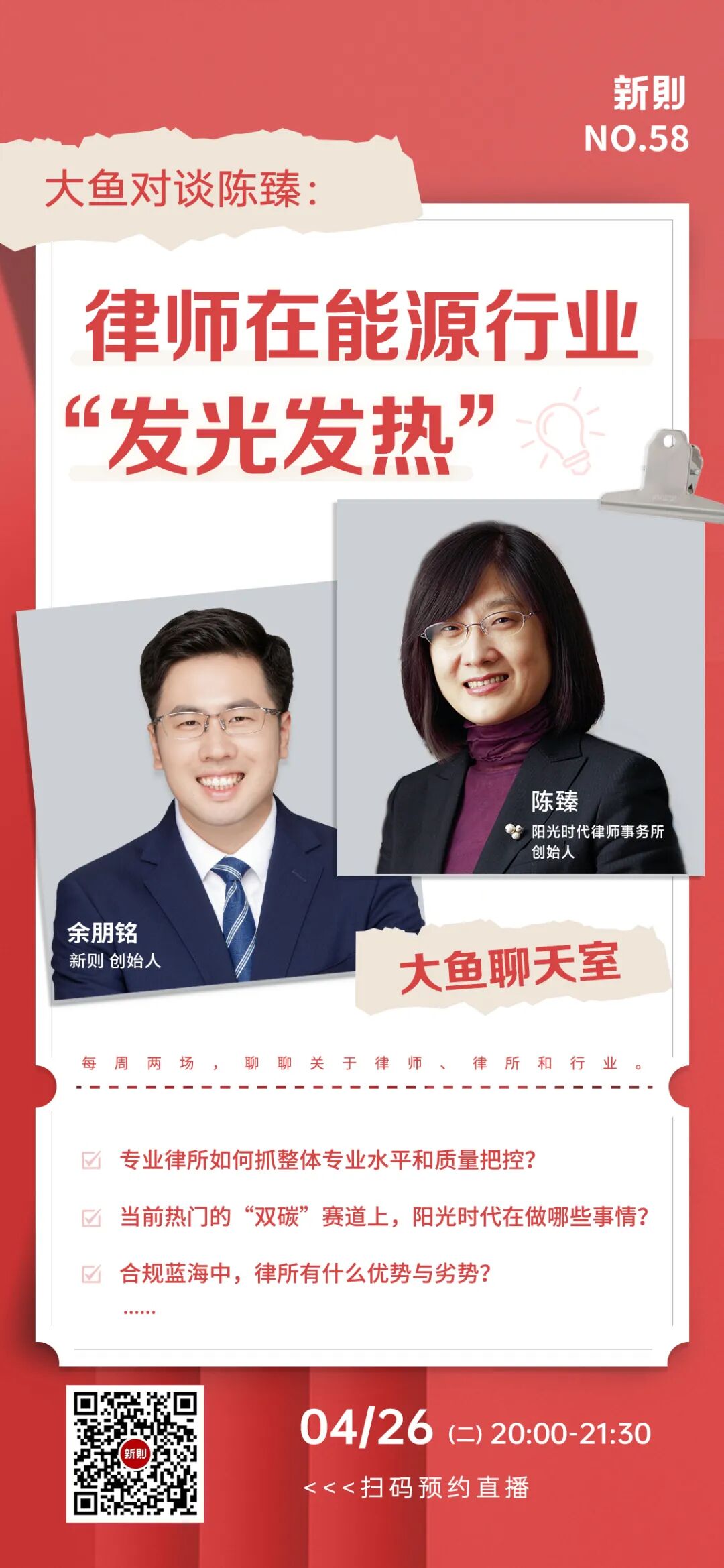 4月26日(下周二)晚上8点,大鱼对谈阳光时代律师事务所创始人陈臻,一起聊聊「律师在能源行业“发光发热”」。直播不可回看,欢迎扫码预约。