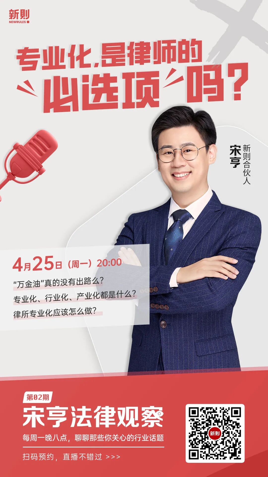 4月25日(下周一)晚8点,“宋亨法律观察”第二期,新则合伙人宋亨与你一起聊聊“专业化,是律师的『必选项』吗?”。直播不可回放,欢迎扫码预约。