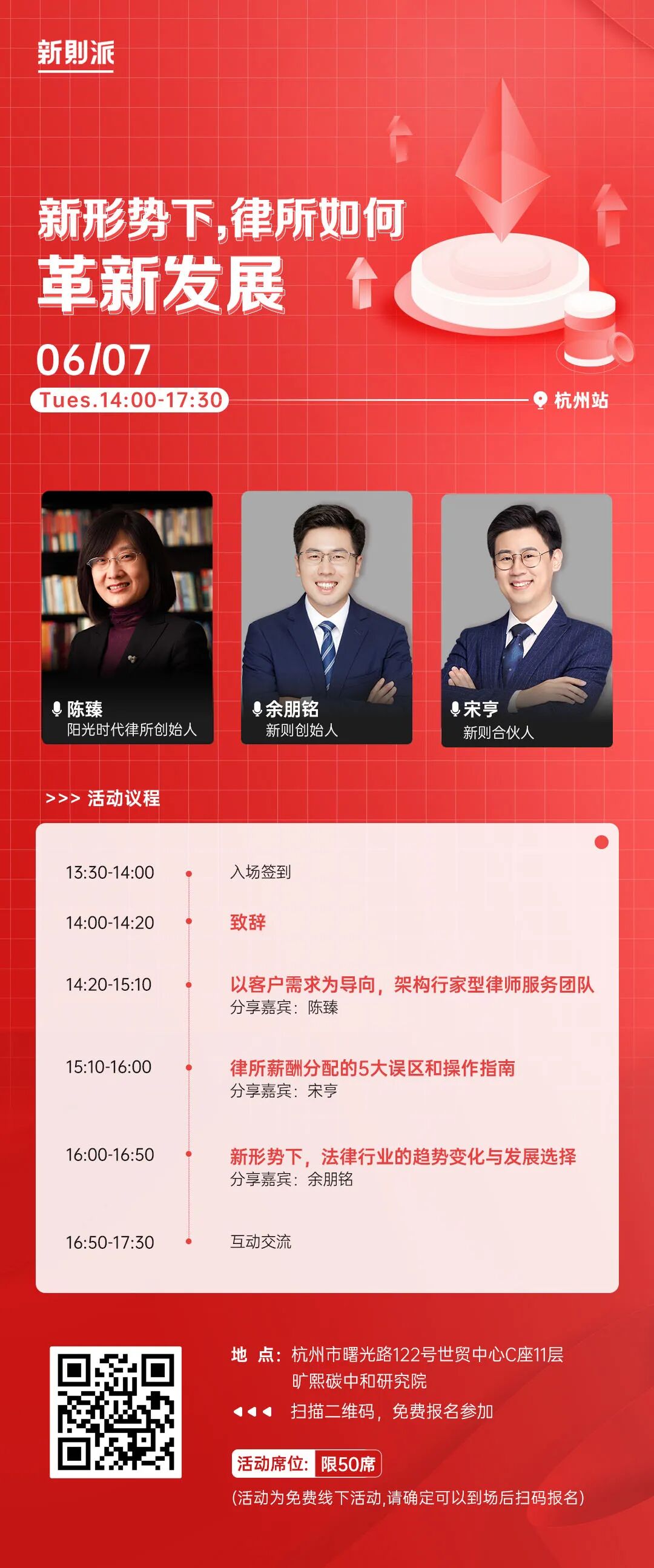 6月7日(周二)下午2点,新则派来到杭州,阳光时代律师事务所创始人陈臻、新则创始人余朋铭及新则合伙人宋亨,将围绕『新形势下,律所如何革新发展』 的主题进行分享。欢迎免费报名。