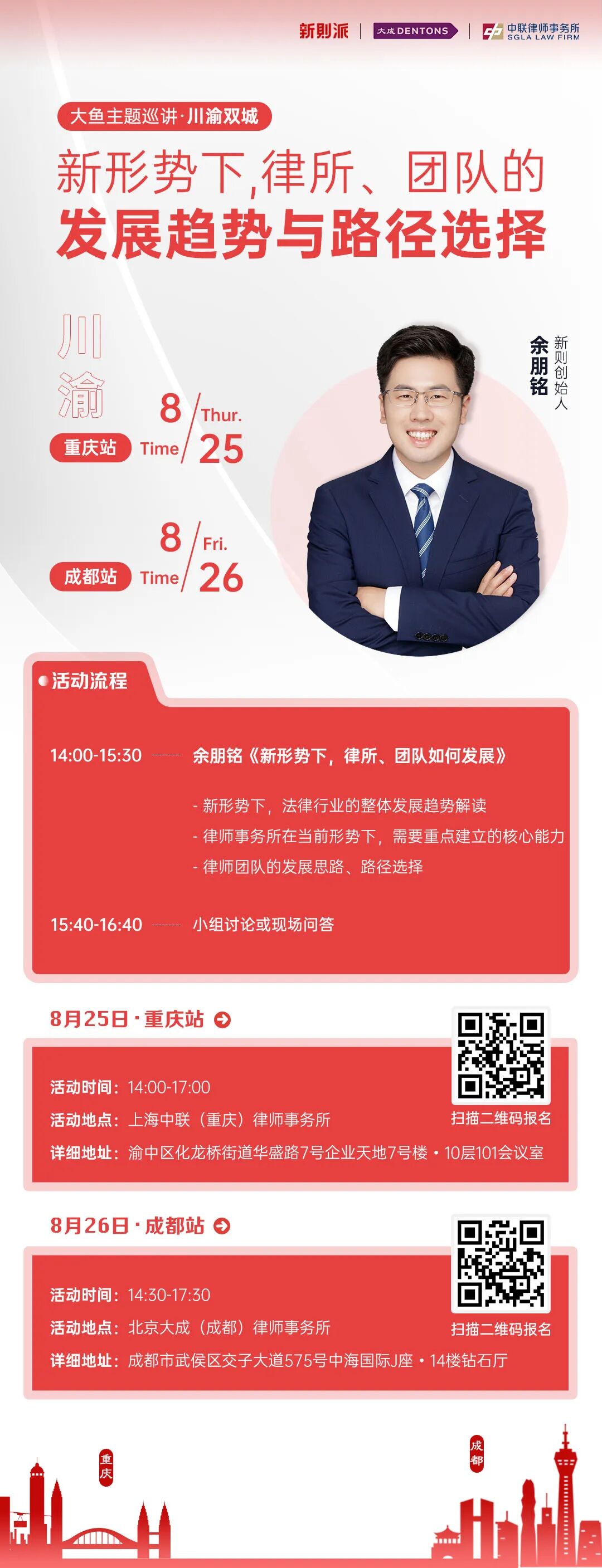 8月25日、8月26日,新则派将分别来到重庆和成都,围绕「新形势下,律所、团队的发展趋势与路径选择」,新则创始人余朋铭将联合上海中联(重庆)律师事务所,北京大成(成都)律师事务所与各位律师伙伴探讨。欢迎扫码免费报名,点开大图即可分别扫码报名。