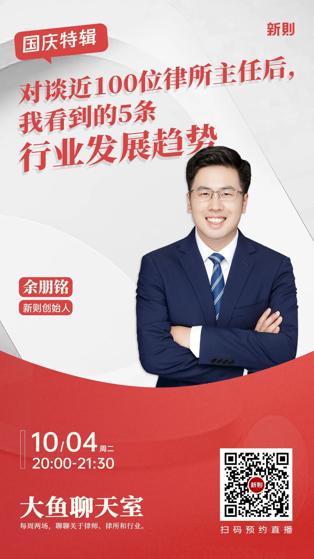 10月4日(周二)晚8点,大鱼聊天室国庆专场,大鱼和你分享“对谈近100位律所主任后,我看到的5条行业发展趋势”。直播不能回放,欢迎扫码预约。