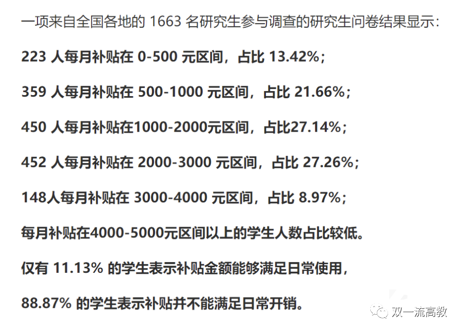 据一项针对研究生的统计显示,88.87%的学生表示补贴不能满足日常开销。