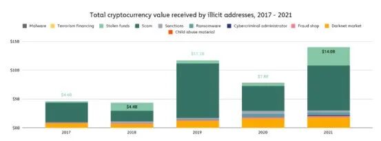 成都链安在1月发布的《全球虚拟货币犯罪态势及打击研究报告(2021)》中写道,国外研究机构Chainalysis公布的数据展示2021年虚拟货币犯罪金额高达140亿美元,较2020年的78亿美元增长了79%,创下历史新高。