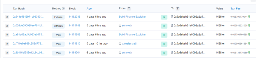 suho.eth发起的提案变更governance,投票设置的阈值较低导致提案通过,通过call调用将build合约的governance更改为0xdcc8A38A地址。
