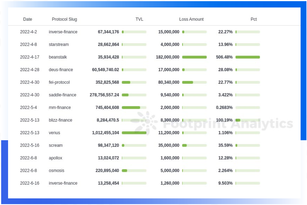 从被攻击项目与被攻击时间的TVL比例来看,大部分情况下损失金额在项目TVL的30%以下。其中也有个别项目如Blizz Finance、Beanstalk,损失达到了TVL的100%甚至500%。