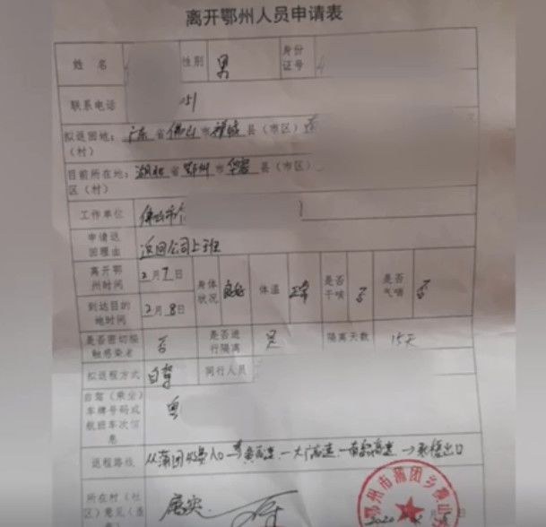 湖北男子胡先生和同伴申请得到有关部门的批准回到广东佛山工厂复工。