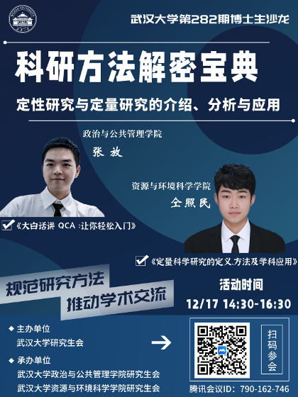 为规范学术研究方法,推动学术文化交流,形成严谨的科学态度和良好的学术氛围,武汉大学研究生会联合政治与公共管理学院研究生会和资源与环境科学学院研究生会以“科研方法解密宝典:定性研究与定量研究的介绍、分析与应用”为主题联合举办了本次博士沙龙活动。此次博士沙龙邀请在学术研究方法方面较为擅长的两位博士生分享定性比较分析(QCA)方法和定量研究法。包括定性研究与定量研究方法的区别、QCA研究方法入门、定量研究常用方法与应用场景等。通过对两种方法的分享,深化研究生对研究方法的领悟,规范研究方法的使用,提升科研能力。