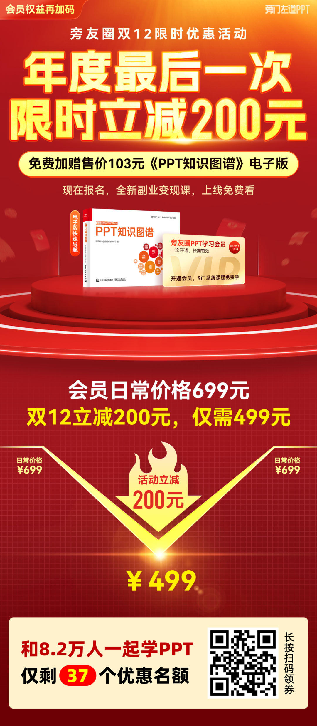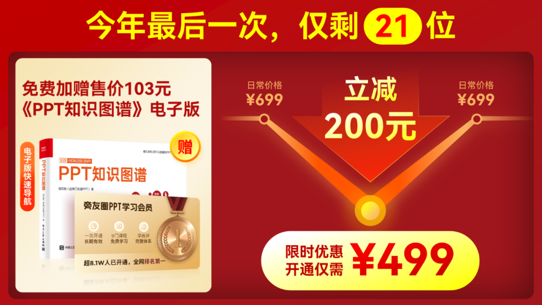 旁友圈PPT学习会员,日常价格是699元,双12立减200元,仅需499元。今年最后一次,优惠力度最大。