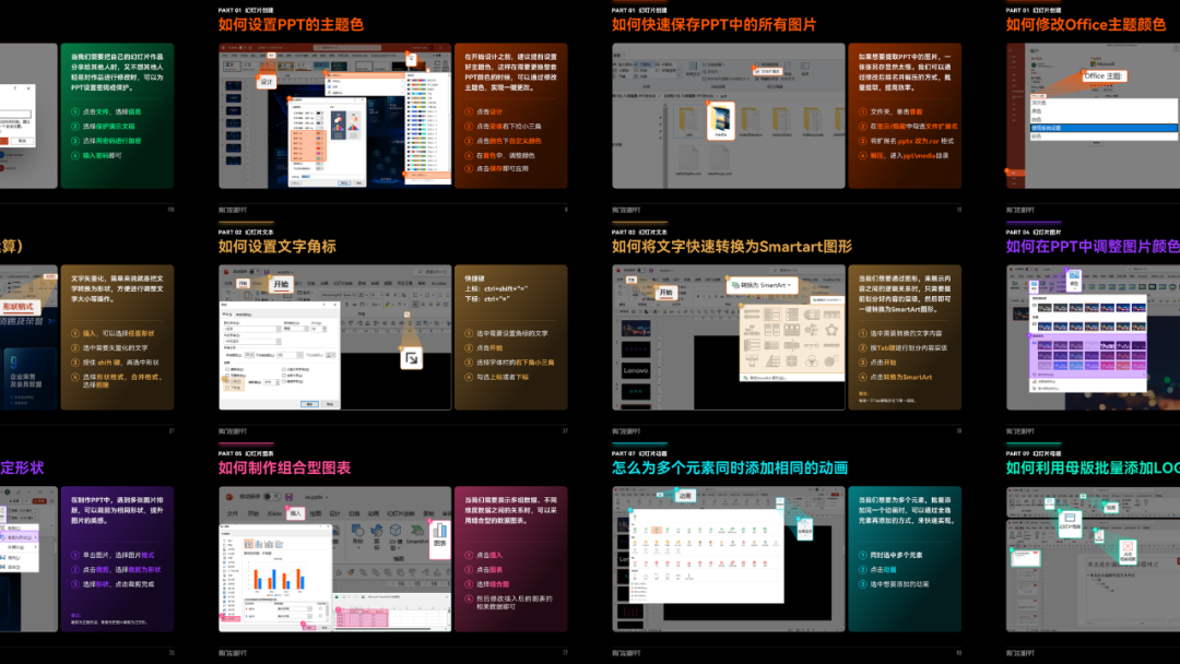 如果你做 PPT 效率贼低,套模板都要花几个小时,甚至连软件功能还没有搞明白。这门基础课一定要看,有31节课,覆盖PPT所有高频操作知识点:3个小时,也就是你看一部电影的时间,PPT基础就通关了,比自己一个人摸索,效率高太多了。而且,学完就能用。因为每一节课,我都会结合具体案例,教会你这个功能是什么,以及应用场景:我们已经帮你把PPT基础知识点,做好了分类整理,可以快速查找,就像查字典一样,很方便:
