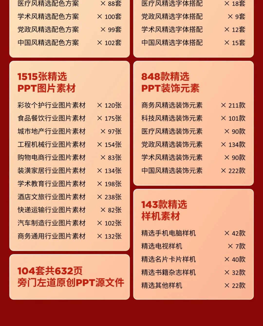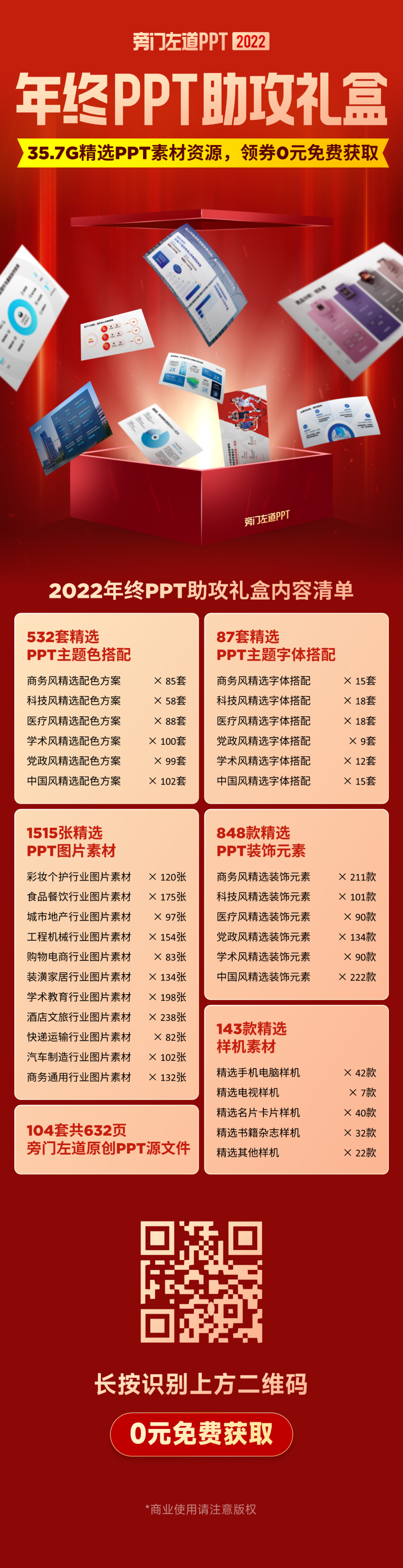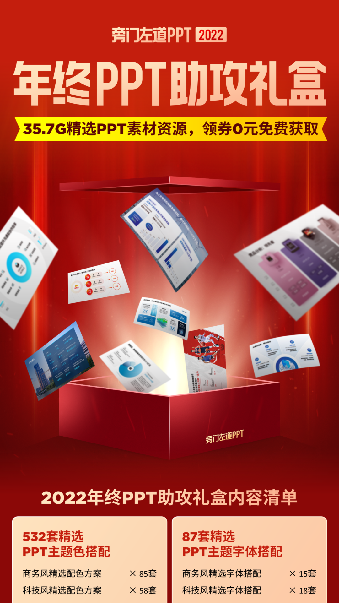 放心,依旧是免费,没有任何套路,不需要转发朋友圈。其实,这个福利已经持续到第三年了,如果是今年新关注的读者,可以看看以往的:不过,虽然是免费的,但我们一样是很认真在去准备,往年的助攻礼盒,也都一致受到了读者的喜爱:里面都是我在直播时,或者是写文章时,修改的一些 PPT 案例。我统计了一下,一共涉及34个不同的行业,所有页面,都是根据真实案例修改而来:当你在职场加班做 PPT 的时候,脑子里没有思路的时候,可以打开这些案例,直接抄作业就好了:很多人做 PPT 最大的问题,是不会配色,为了解决你的问题,我帮你整理好了这些配色方案:当然,因为大家做的 PPT ,可能是不同风格,所以考虑到这一点,我把这些配色方案做好了分类。共分为6大主题风格,像商务主题、学术主题、医疗主题、党政主题……使用的时候呢,从中挑选一个你喜欢的配色方案,直接使用就可以了:比如标题用什么字体,正文用什么字体,搭配好了 PPT 排版才会更美观:而且,我们帮你做好了不同风格的分类,适用于不同的 PPT 主题:下载之后,可以看到不同的文件夹,这些是我们的设计师,帮你搭配好的方案,喜欢哪一套,安装后直接用:在做 PPT,尤其是排版截图、文件、证书的时候,少不了样机。配图绝对是刚需,更关键的是,怎么找到不同行业的优质图片,对吗?所以,这一次,我们一口气帮你们整理了11个行业的优质配图,像家居、工程、汽车、快递、学术……当你觉得 PPT 页面太空洞的时候,加点装饰素材,是一个不错的做法。而且,素材质量也是很高的,用我们设计师的话说,就是尽量找一些不常见,但高级的素材: