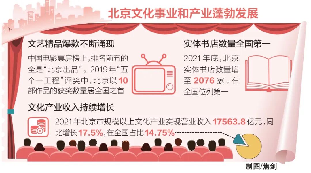 从创造票房神话的《长津湖》到全国热播的《觉醒年代》;从打造“一刻钟公共文化服务圈”到喜获全国“书店之都”称号;从隆福寺、首钢等文化新地标的崛起到不断更新的“网红打卡地”榜单……五年来,北京文化事业和产业蓬勃发展,文化软实力和影响力持续增强,充分彰显了全国文化中心的引领示范作用,更让市民的获得感和幸福感显著提升。