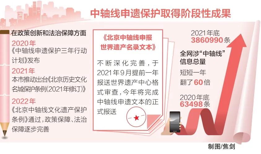 近年来,北京市花大力气开展文物修缮,取得了明显成果。《中轴线申遗保护三年行动计划》指明中轴线申遗工作的时间表和路线图,明确48项重点任务。至今年,北京城的“脊梁”上,钟楼、景山兴庆阁、社稷坛中山堂……一颗颗历史明珠被擦亮。