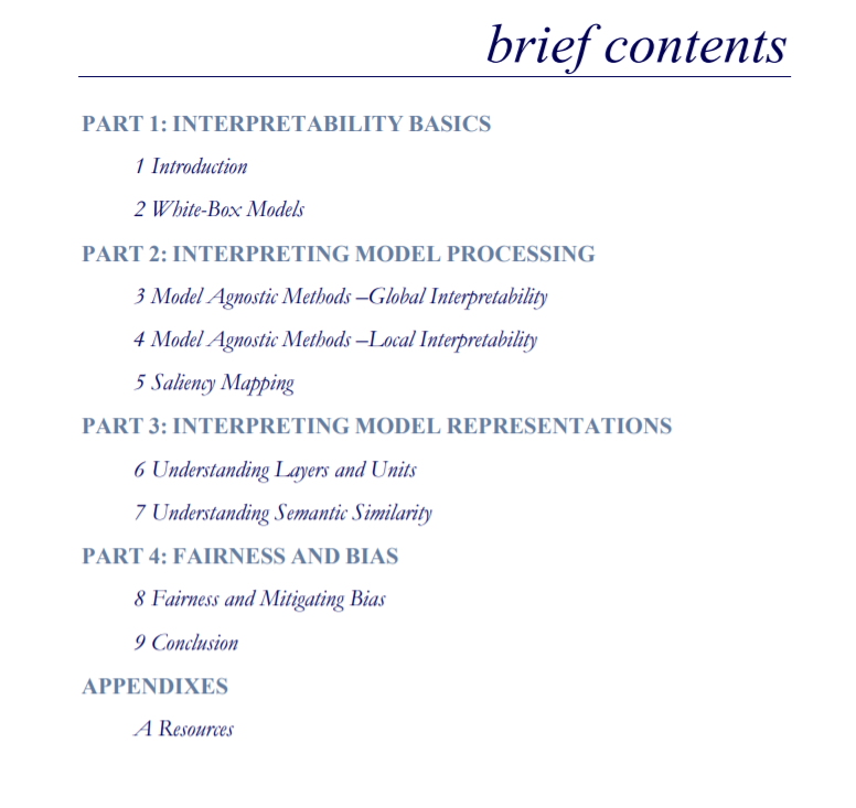 随着图像识别、自然语言理解和桌面游戏等领域的突破,人工智能和机器学习正在彻底改变医疗、制造、零售和金融等各个行业。随着复杂的机器学习模型被部署到生产中,理解它们变得非常重要。缺乏深刻的理解会导致模型传播偏见,我们在刑事司法、政治、零售、面部识别和语言理解中都见过这样的例子。所有这些都对信任产生不利影响,从我的经验来看,这是企业抵制在整个企业部署人工智能的主要原因之一。解释人工智能是研究和行业的一个热门话题,因为现代机器学习算法是黑盒,没有人真正了解它们是如何工作的。此外,在GDPR的“解释权”下,欧盟现在有解释人工智能的规定。因此,对于人工智能从业者来说,可解释性人工智能是一个非常重要的话题。有一些资源可以与这个活跃的研究领域保持同步,如调研论文、博客文章和一些书籍,但没有一个单一的资源涵盖所有对实践者有价值的重要技术。也没有关于如何实现这些尖端技术的实用指南。本书旨在通过提供对可解释性技术的简化解释,以及如何在Python中使用开放的公共数据集和库实现这些技术的实用指南,来填补这一空白。本书将展示代码片段,并分享源代码,以便您跟随和再现书中的图形和视觉效果。这本书旨在为您提供实现和部署最先进的可解释性技术的实用技巧。具备概率论、统计学、线性代数、机器学习和Python的基本知识。