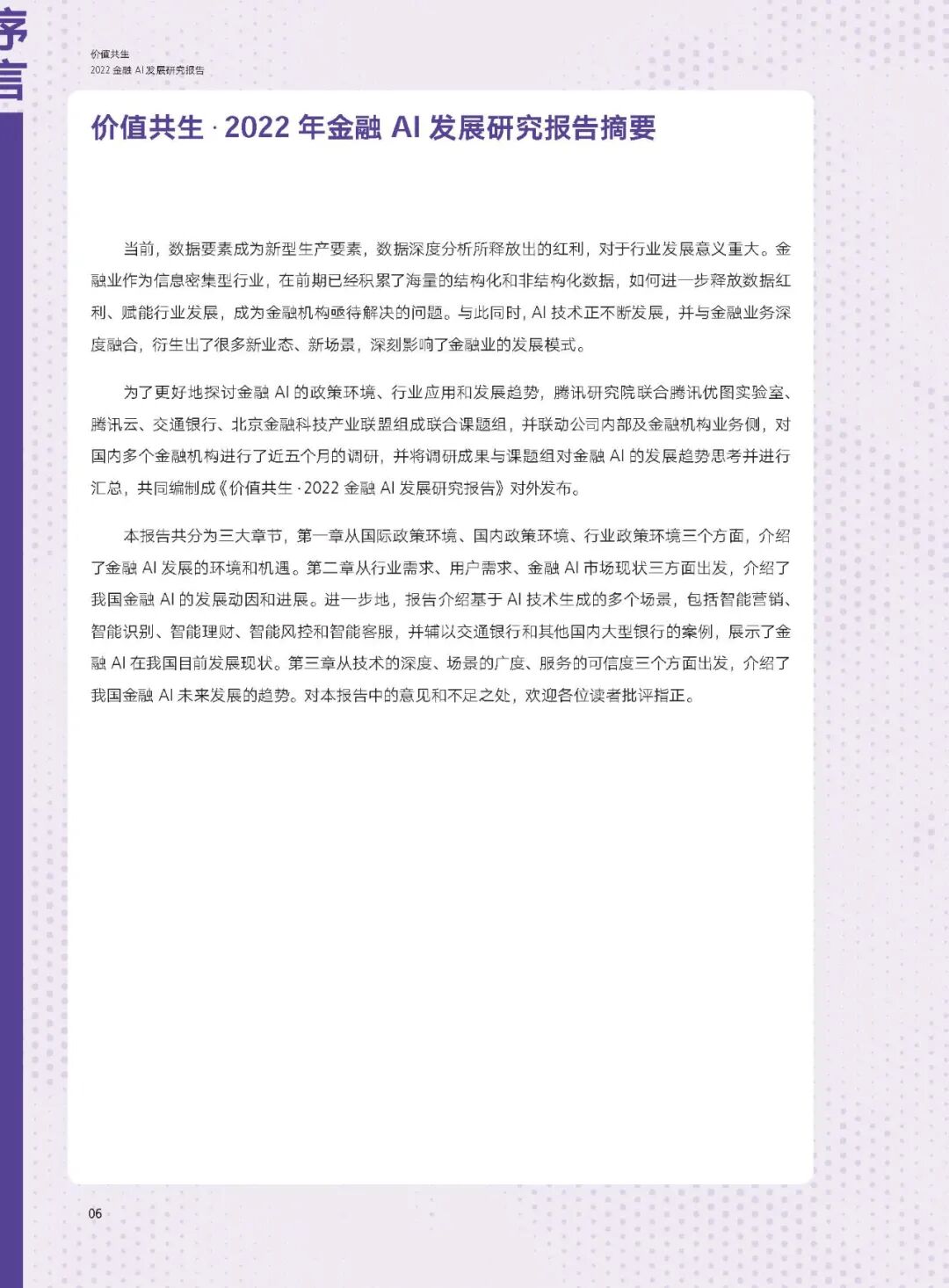 报告分为三大章节,从政策、行业、趋势三个层面出发,详细阐述了金融AI的发展环境与机遇、典型场景与案例、发展趋势与展望,全景呈现在数实融合加速的时代背景下,金融与AI深度融合创新所产生的积极影响和趋势洞察。