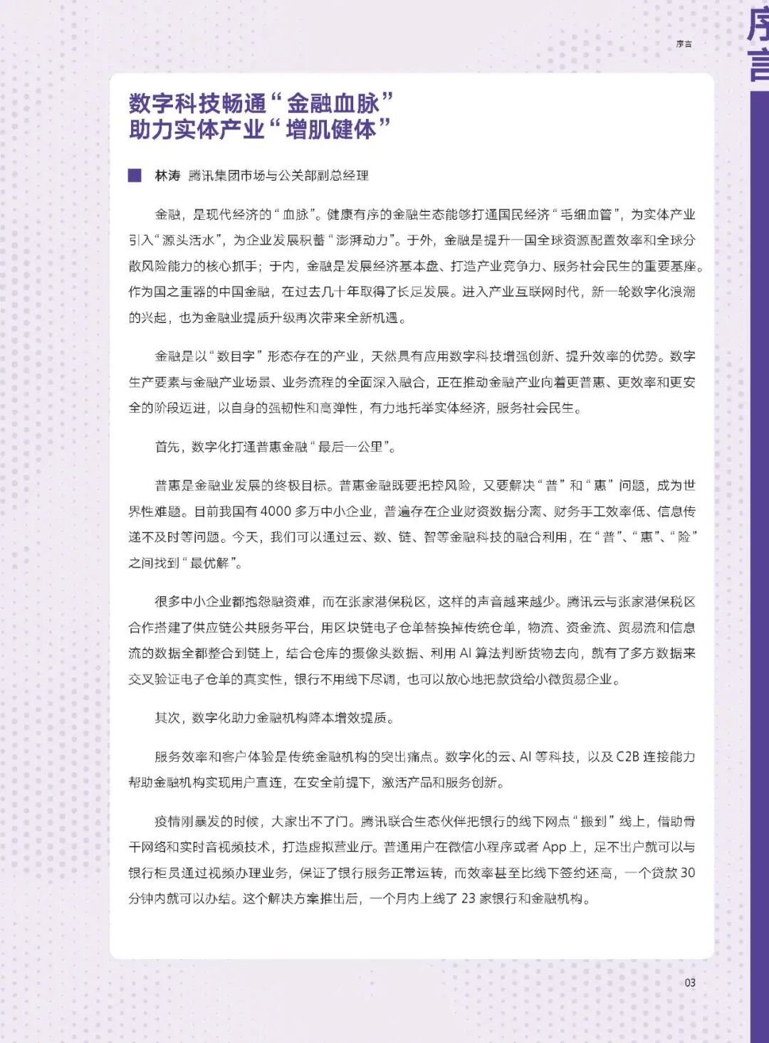 在行业层面,AI赋能智能金融场景创新,金融服务能力不断提升。在AI与金融的加速融合下,催生出了智能营销、智能识别、智能理财、智能风控、智能客服等多种提升金融价值的场景。报告通过这五个场景和五个案例,展示了金融AI在我国目前发展现状。以交通银行融合了计算机视觉、机器学习、人工智能等新技术的“统一图像识别平台”为例,腾讯优图通过引入多模态技术提高信息抽取的泛化性能,助力解决非标准文档的OCR信息结构化提取,提高图像、单据识别率,推动业务效率以及用户体验提升。同时,该平台在信息录入等方面时长降低98.4%,且准确率高,能够大量节约人力成本。