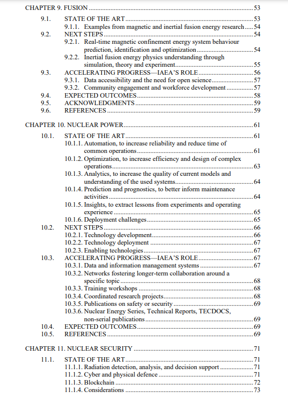 在核科学领域,人工智能驱动研究的重点是核数据流程的自动化。这些努力包括,例如,通过使用自然语言处理应用程序编译来自出版物的数据集,以及正在进行的使用ML方法进行鲁棒推理和有意义的不确定性预测的工作。此外,人工智能还可以协助验证任务和验证实验的设计。在核物理学界,人工智能和ML方法被应用于数据分析和理论建模,以提高科学理解和提高数据处理和管理的效率。进一步的努力涉及未来实验的设计和现有装置的优化,以及用于核物理的设施的操作,例如粒子加速器。最近在应用人工智能和ML方法解决磁约束和惯性约束聚变研究中的突出问题方面取得的成功表明,这些方法具有显著加速聚变研发的潜力。全球范围内的融合研发工作可以通过AI和ML更广泛地参与融合问题解决方案而受益。在核电领域,行业可以在自动化、设计优化、数据分析、预测和预测、见解提取等领域受益于AI。目前的工作重点是将人工智能技术从试点研究转移到更广泛的应用。在辐射防护方面,人工智能的应用及其与控制和监测过程的集成(如外部照射的个人剂量测定)有望产生更快、更灵活和更有效的过程,并有可能在该领域实现深层次的技术变革。特别是人工智能在分析、解释和理解包括辐射暴露在内的复杂工作过程时,可以模拟人类的认知。