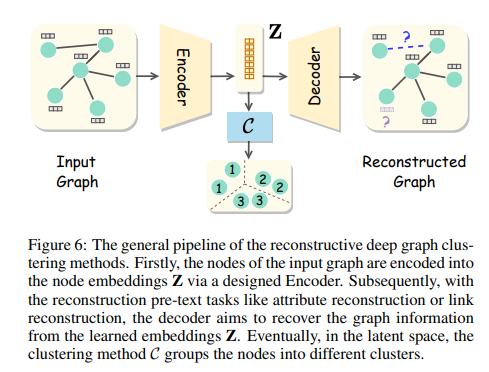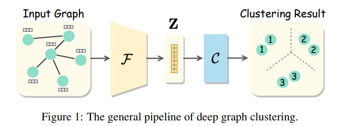 首先,深度图聚类的一般流程如图1所示。对编码神经网络F进行自监督训练,并将节点嵌入到潜空间中。然后,设计的聚类方法C将节点嵌入Z分离成几个不相交的聚类。详细的公式和重要的基线可在第2.1节中找到。