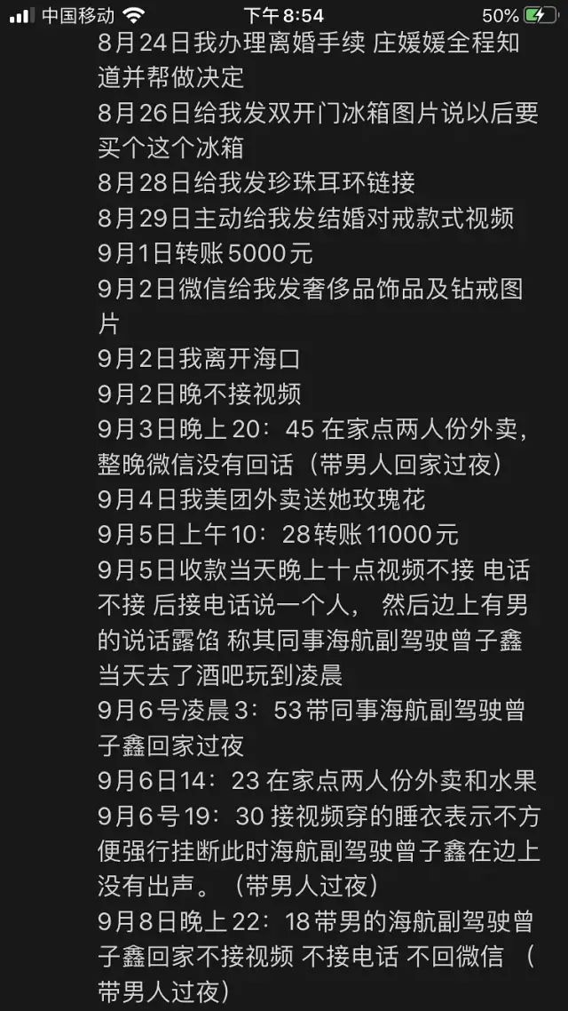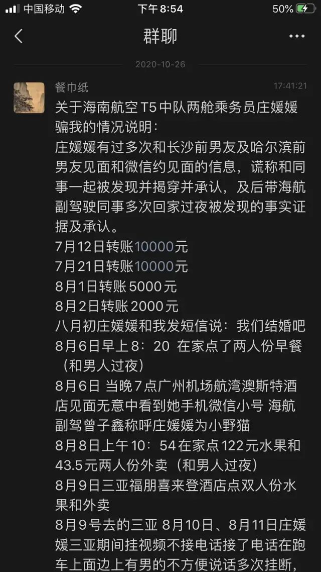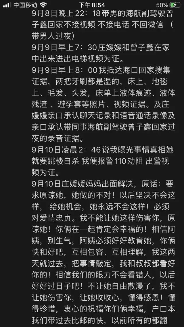 近日一位网友在网上发布一篇《海南航空乘务员庄xx骗我》的情况说明,自曝家丑。他发现准备结婚的未婚妻,竟然同时交往几个男朋友。甚至多次带同机组的副驾驶同事回家过夜,在被多次发现出轨事实后,女方依然毫无悔改之意。一怒之下,当事人找了自媒体全程录像,并将证据公布于众了……