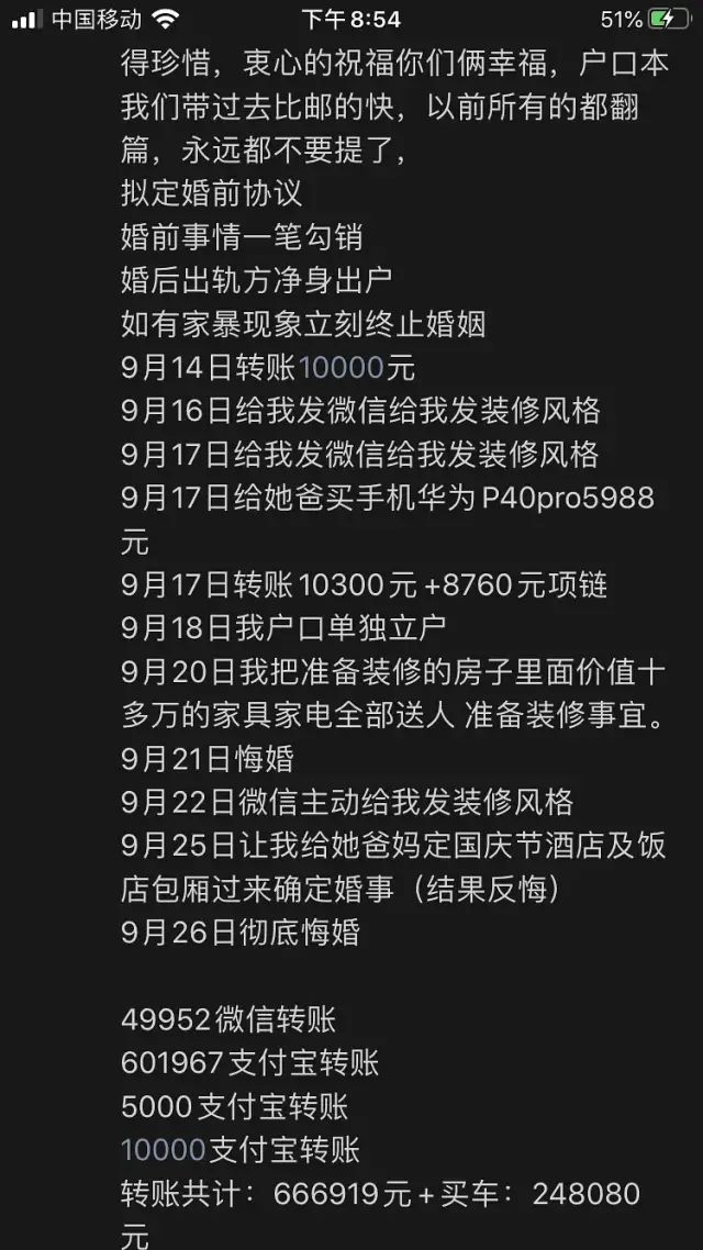空姐痛哭流涕地说,“我承认花了你的钱,我可以还给你呀!”。男方称:“总共100多万,还给我有明确转账记录的70万,车就给你了。”,而女方称:“还给你60万、定情手镯这些首饰都给你。”