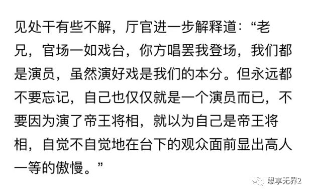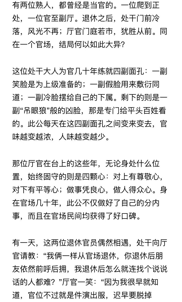 为官者当引此为戒,千万别一穿上演出服就彻头彻尾地忘记了自己是谁。官场只是你人生的一部分,有时间去练那些不同的面孔,不如守护好自己的一颗平常心,等你离开官场,走下戏台之后,也好有一处安妥灵魂的地方。