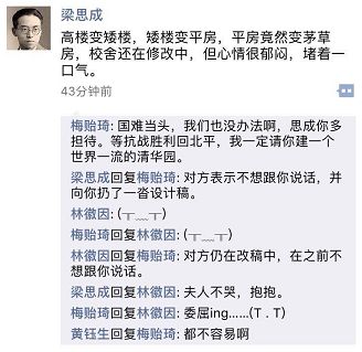 最近,梁思成和夫人林徽因在设计西南联大的校舍,但越设计心情就越不好,于是发了条朋友圈。