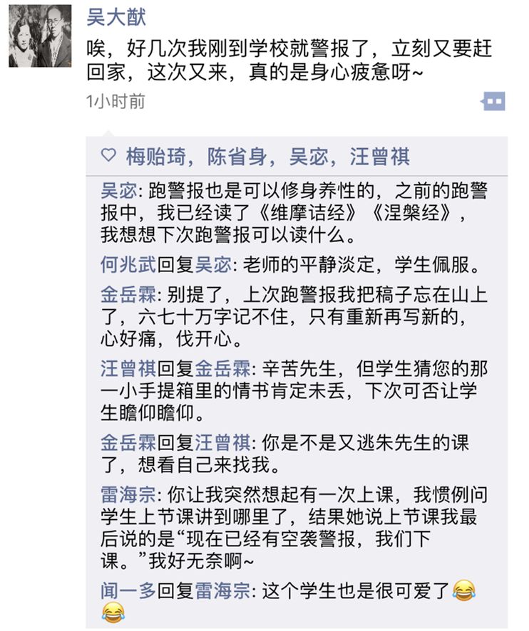 于是,这里有了一个大胆的想法:假如当时西南联大的教授有了朋友圈,想必是非常有画面感了。