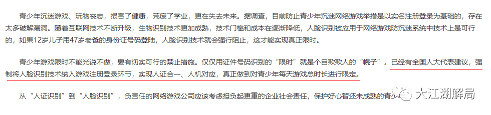并在文末提出了与我一致的观点:强制将人脸识别技术纳入游戏注册登录环节,实现人证合一、人机对应,真正做到对青少年每天游戏总时长进行限定。