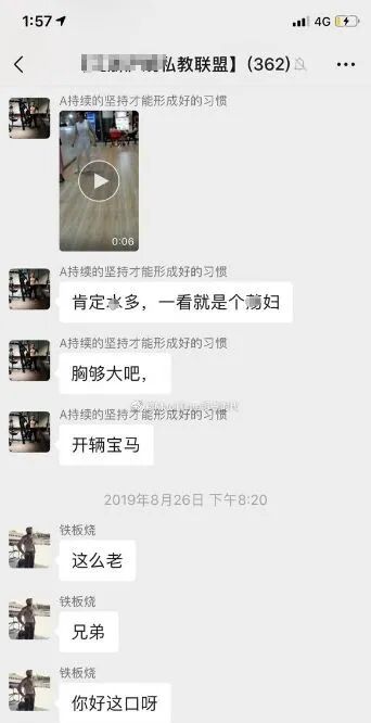 女学员在健身,男教练却在一旁偷拍,然后被公开发到群内讨论。▼