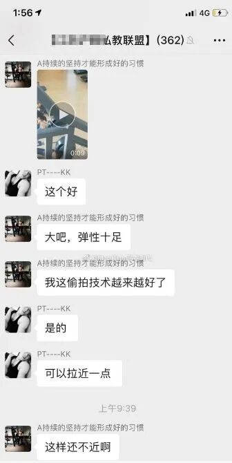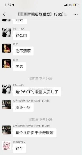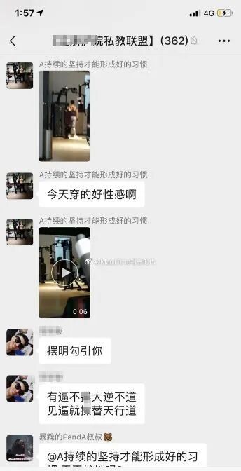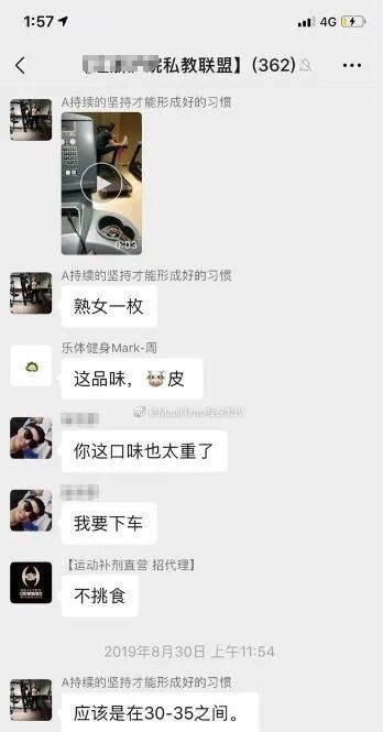 与此同时,早些时候网上爆出了一组惊人的聊天记录,尺度之大,震惊健身圈。前天,某健身博主在微博晒出几张截图,曝光了某私教联盟的聊天记录,当中各种偷拍秀下限,让人看了震怒不已,私教乱象再一次被推上风口浪尖。▼