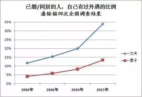 2000年,男性出轨率是11.8%。到了2015年变成了34.8%。翻了3番。