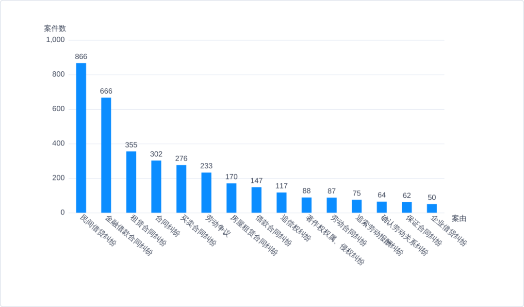 最后我们看看珠宝行商主动起诉其他民事主体的这1404个案件,上图是排名靠前的15类民事纠纷案件的数量统计情况: