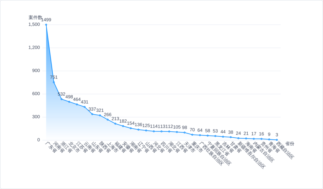 这里我们仍旧以珠宝行商牵涉最多的6868个一审民事案件为基础,对各地的民事纠纷案发数量进行了统计。各省的案件数量由多到少依次为:广东省(1499件);河南省(751件);浙江省(532件);北京市(498件);江苏省(464件);云南省(431件);山东省(337件);陕西省(321件);上海市(266件);福建省(213件);安徽省(182件);湖南省(154件);辽宁省(136件);山西省(125件);河北省(114件);四川省(113件);湖北省(112件);江西省(105件);天津市(98件);重庆市(70件);广西壮族自治区(64件);宁夏回族自治区(58件);黑龙江省(53件);吉林省(44件);甘肃省(38件);新疆维吾尔自治区(24件);海南省(21件);内蒙古自治区(17件);贵州省(16件);青海省(9件);西藏自治区(3件)。