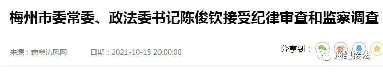 梅州市委常委、政法委书记陈俊钦涉嫌严重违纪违法,目前正接受广东省纪委监委纪律审查和监察调查。