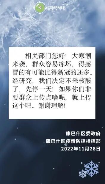 相关部门您好!大寒潮来袭,群众容易冻坏,得感冒有可能比得新冠的还多。经研究,我们决定不采核酸了,先停一天,如果你们非要群众上传点啥呢,就上传这个吧,谢谢理解。落款为康巴什区委政府和康巴什区疫情防控指挥部。