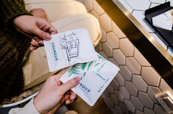 除此之外,在外卖上,热饮多套一个杯子用来保温,还升级了一款设计感不输瑞幸的外卖纸袋。新客首次点单会赠送一包店内的挂耳,熟客点单会赠送新产品的试饮装,增强顾客的附加值,提升复购率。