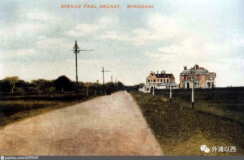 上图是一位画家在1905年郊外写生作品,他支起画板的地方还是一条土路,他画的那两栋房子分别是现在的日本驻上海总领事馆官邸和美国驻上海总领事馆,还没有法国驻上海总领事馆官邸或者被遮挡了,应该不会,如有三栋楼的话他一定会把画板支到土路更佳的位置去画的。