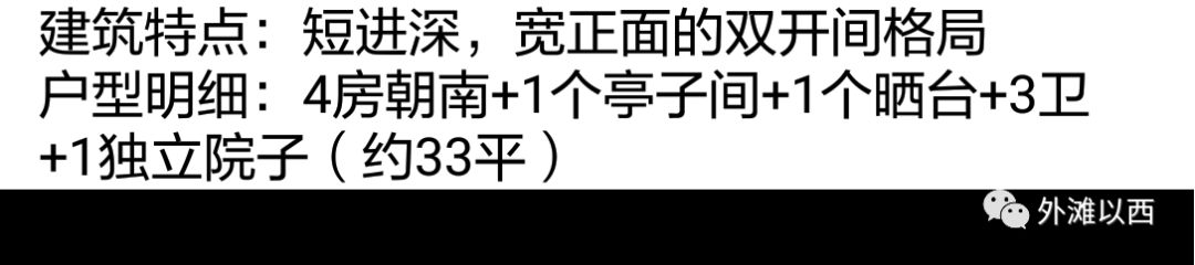 第二段:介绍房型,看得出要突出南面的面宽和一般新里洋房不一样的,这个卖点抓得对的,好,有了独立院子(就是小花园或者大天井)面积33平方米,这样算出来房屋占地面积为77平方米,这样就基本知道了三层楼的情况了,一楼的厅的最大面积为50平方米(两间打通后),因为还有楼梯小卫生间和厨房间的面积。