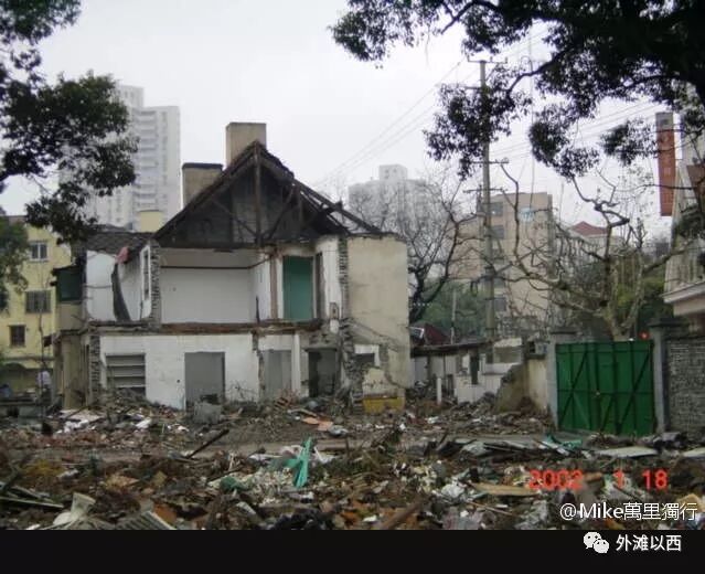第二,Mike拍摄的照片有部分已经成为重要的史料,对照历史文书看的话感叹太多。如淮海中路1754弄改造为淮海中路1768弄的过程中,修旧如旧的改造原则被错误理解,老建筑被推倒重建。在建筑保护业界这个名叫霞飞别墅的小区和建国西路上的建业里的改造模式一直有争论。在如下的图中靠近武康路一侧的房子已经拆了一半,右侧的红底白字招牌上写的是房地宾馆,武康路378号,楼下有过网红面包店,出了食品安全问题关门歇业,现在来的是皮爷咖啡馆。