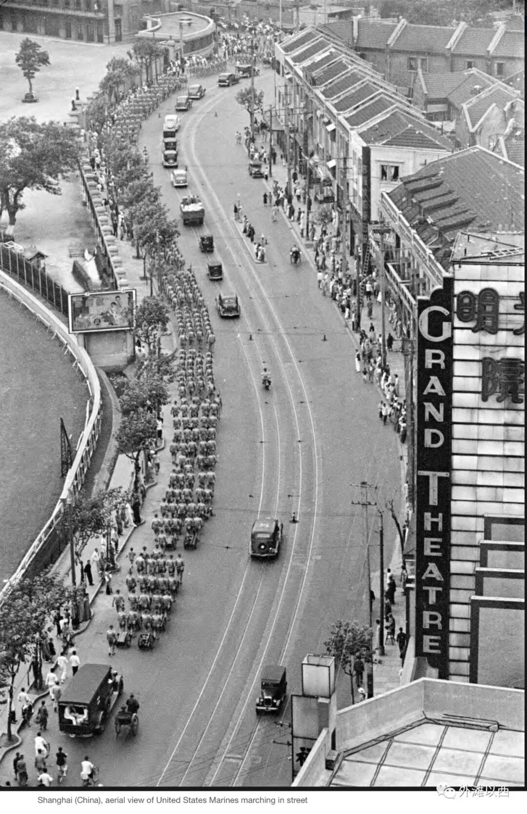 如福曼在高处拍摄到的美国海军陆战队路过此地,1938年。