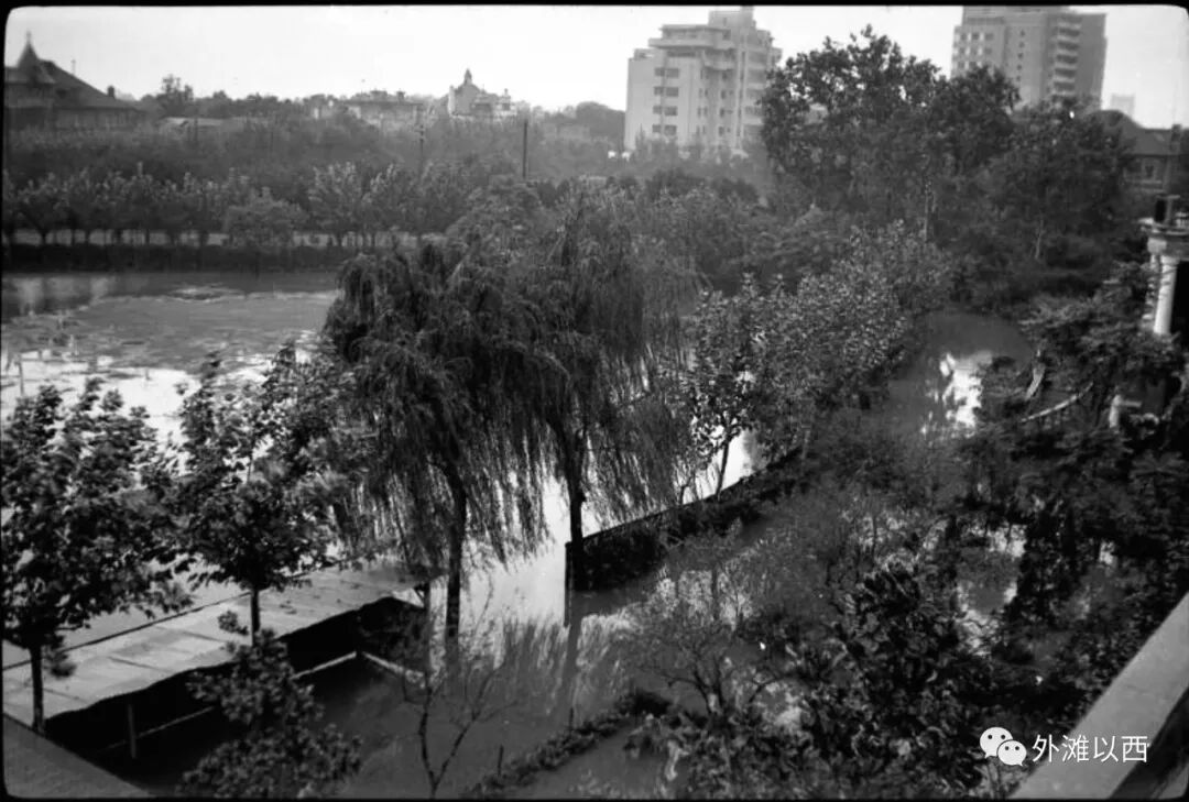 找到如下这张旧照片非常偶然,1937年上海遭受台风和暴雨袭击,城区多处积水,一些行道树和花园洋房的篱笆墙都拔根和吹垮。这张照片正反映了杜美路法国学校的大操场水漫金山的实际情况,可能是老师们想要向学校董事会汇报受灾严重程度吧,拍下来。结果我们在背景上看到了两个尖顶,一个就是今天的淮海中路1131号,一个从透视角度看是淮海中路1105号席家旧居,上音人都称之为“附小”的大洋楼。