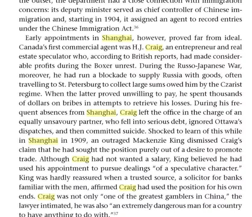 历史学家 John D. Meehan在《Chasing the Dragon in Shanghai:Canada’s Early Relations with China, 1858-1952》写道:Canada's first commercial agent was H.J. Craig, an entrepreneur and real estate speculator who, according to British reports, had made considerable profits ····一直以为他是英国人但人家是加拿大人,且生意做得最好的那个人,静安寺路西摩路口的超级大花园洋房就是最好的有力升的证明。如书名所说的,他在上海抓住了中国机会,从而获取了上海近现代商业和房地产黄金时代的暴利。