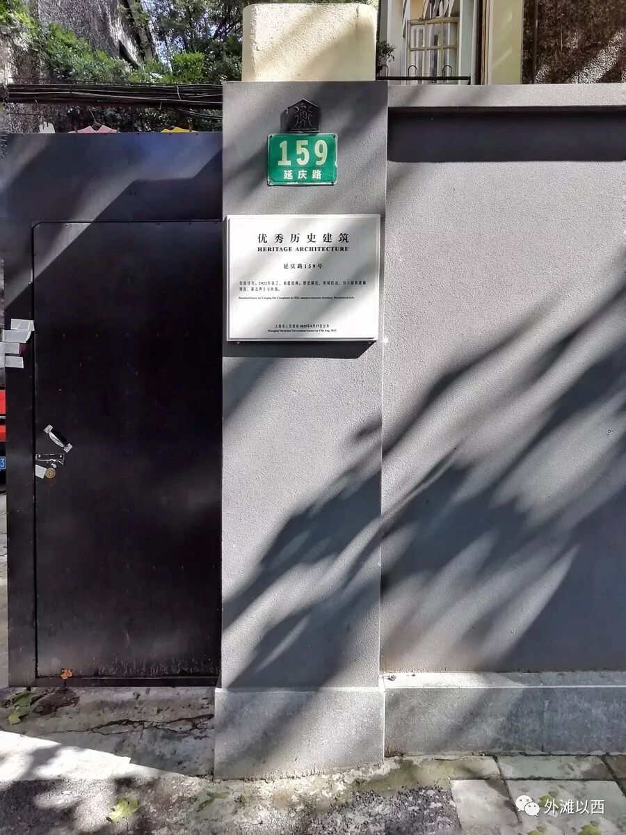 瑞华公寓延庆路一侧的隔壁人家是延庆路159号,最近大修期间大门常开,麦小姐有机会转悠进去,大宅的花园面积是此地最大,老洋房造型简洁,两层,门口的优秀历史建筑铭牌写此房1923年建造。