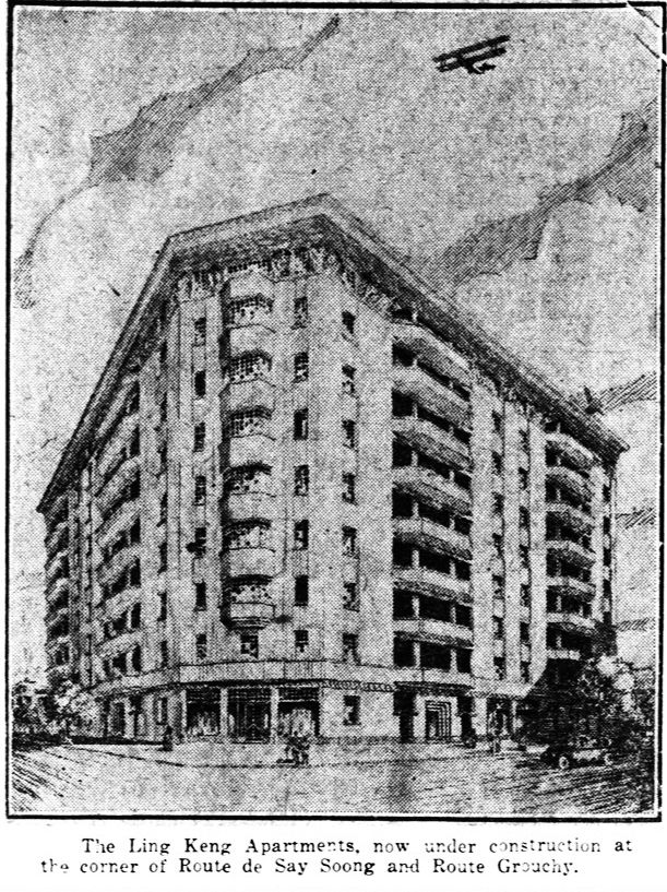 1929年3月3日《The Shanghai Sunday Times》以MODERN APARTMENT HOUSE的标题配发一张图片,下面那行字翻译过来,在善钟路和格罗希路转角处新大楼的名字叫“Ling Keng公寓”。
